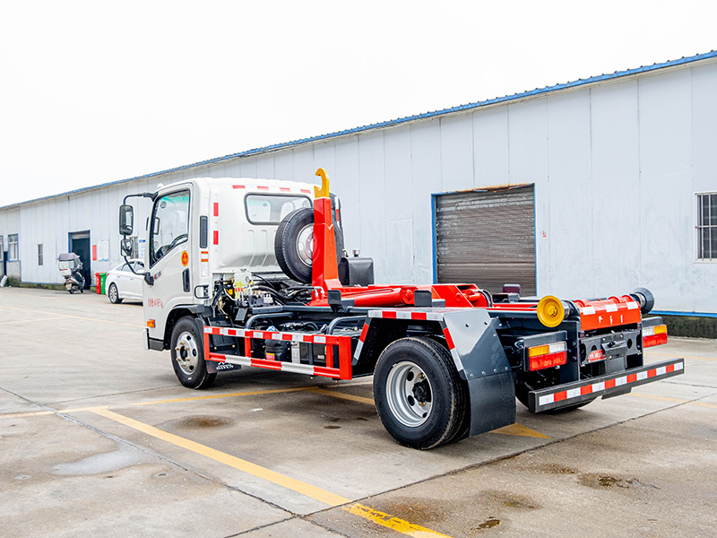 該車可將地下垃圾箱內(nèi)的垃圾及垃圾箱一同拉車上運走同時可自卸,降低了工人的勞動強度。該垃圾車的收運方式是目前世界上廣泛采用的垃圾收運方式,可以實現(xiàn)一車多箱,大大降低了配備成本和空間等等;其專用裝置的功能均以汽車發(fā)動機為動力,通過液壓機構(gòu)手動或電控來實現(xiàn)。車輛的箱體采用優(yōu)質(zhì)炭鋼板全密封焊接結(jié)構(gòu),具有強度高、重量輕、不產(chǎn)生二次污染等優(yōu)點。
