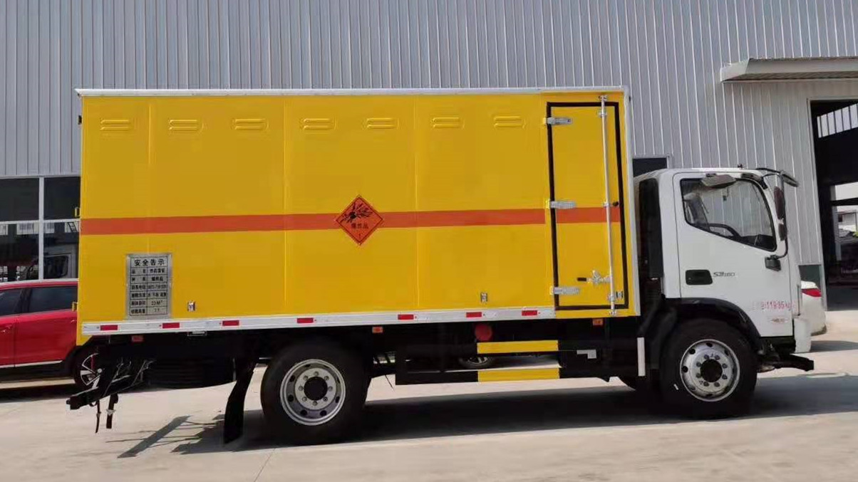該車適用于運輸危險品,隨底盤選裝駕駛室,選裝右側(cè)不開門;危險貨物運輸車輛的類型(EX/Ⅲ),廂體頂部封閉,不可開啟,運送爆炸品的品名:黑火藥,壓縮黑火藥,電(非電)引爆雷管,爆破炸藥,導(dǎo)爆索,點燃導(dǎo)火索;運送爆炸品的項號:1.1D,1.1D,1.1B,1.1D;安全裝置為導(dǎo)靜電帶,用于防止靜電;僅采用底盤子午線輪胎和帶ABS的底盤,該車前輪安裝盤式制動器,前置排氣管,裝配限速裝置,限速80km/h;安裝帶有衛(wèi)星定位功能的行駛記錄儀;側(cè)防護(hù)和后防護(hù)裝置材料材質(zhì)為Q23**碳鋼,側(cè)防護(hù)與箱體底板和副梁焊接連接,后防護(hù)裝置與車架采用焊接連接。后防護(hù)截面尺寸(mm):120×50,離地高度為500mm。整車長度/軸距/后懸對應(yīng)關(guān)系為(mm):7030/3800/2**。僅采用發(fā)動機F3.8NS6B156對應(yīng)的油耗值(L/**km)為:20.81。ABS系統(tǒng)**器型號/生產(chǎn)企業(yè):ABS-E/威伯科汽車**系統(tǒng)(**)有限公司,ABS-VI·E/廣州瑞立科密汽車電子股份有限公司。轉(zhuǎn)向輪裝備輪胎爆胎應(yīng)急防護(hù)裝置。隨底盤選裝駕駛室。 |